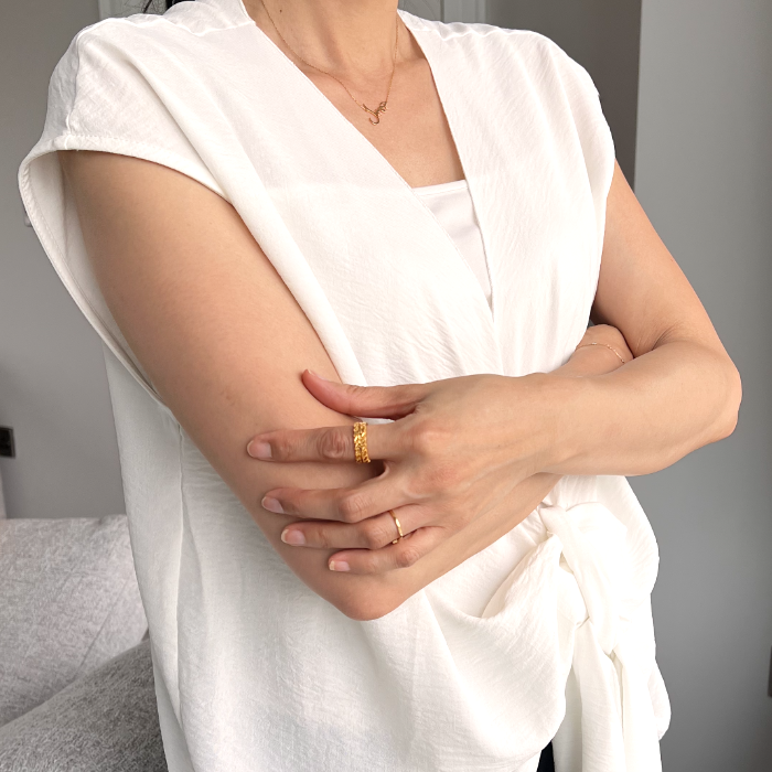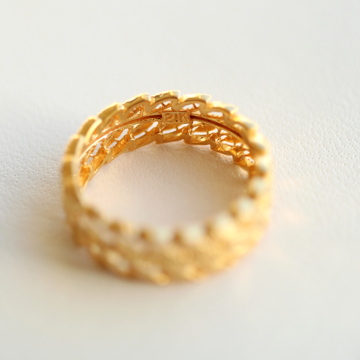 一般的なジュエリーで使われる18K(純度75%)よりもさらに高純度の21K(純度87.5%)。
