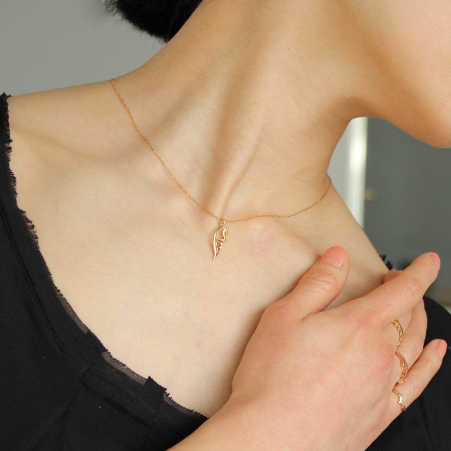 静かにきらめく光を纏うように身につけられる、縦長シルエットのミニマルジュエリー。